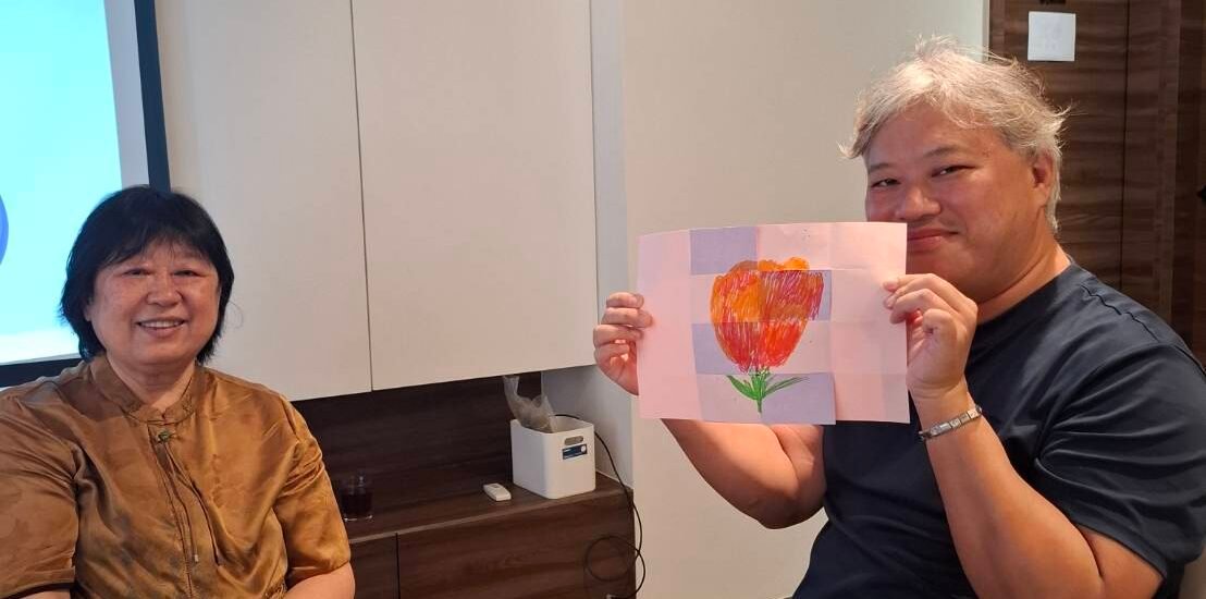 有人畫了一朵盛開的花,說那是自己年輕時的看過的花;有人畫了一隻蝴蝶,笑著說:「牠從毛毛蟲變成漂亮的蝴蝶了。」